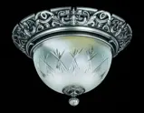 Потолочный светильник с латунным каркасом, на котором находится стилизованный цветочный мотив, и плафоном из матового стекла ручной огранки. Металлические части украшены черной патиной. Люстра подходит для небольших помещений с низкым потолком, оборудованых в историческом или деревенском стиле.