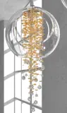 Лампочка окружена длинной завесой из подвесок из ограненного хрусталя, прикрепленных к стальным тросам. Изящная структура подвесок создает плотный, вертикально структурированный каскад, переходящий вниз в более крупные, точно сформированные капли. В целом, светильник выглядит богато и обладает выразительным декоративным характером.